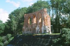 Am Sonntag ließen wir wegen der Erfahrung vom Vortag den Abstecher auf der Landstraße nach Kamien Pomorski weg, was auch gut war. Ich hatte mich nämlich knapp bei den km für heute verrechnet und so passte es wieder. Dafür konnten wir eine ehemalige Kirche – oder was übrig ist – bei Rewal ansehen, die einst 2 km im Land gebaut wurde, dann aber nach und nach in’s Meer bröckelte und heut nur noch eine Fassade direkt an der Küste übrig hat. Das Mittagessen war heut mal richtig reichlich und gut (wo die wohl ihre Fische züchten?). Den 2. Teil des Tages hatten wir Glück, dass ein ehemaliges Militär-Sperr-Gebiet heute für Radler freigegeben ist und wir somit den Straßen entkamen und eine wunderschöne, einsame Steilküste zu sehen und zu bewundern bekamen.Der Weg war allerdings von heftigen Kopfsteinpflaster geprägt, was nicht jedem Rad bekam und eine kleine Reparatur der Taschenaufhängung von Sandra nötig machte.